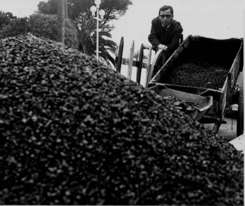 Bernar Venet in front of a pile of coal mixed with tar, avenue Albert 1er, Nice, 1963. Photo: Philippe Bompuis.