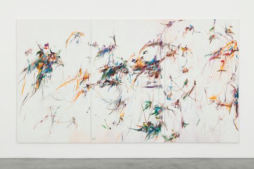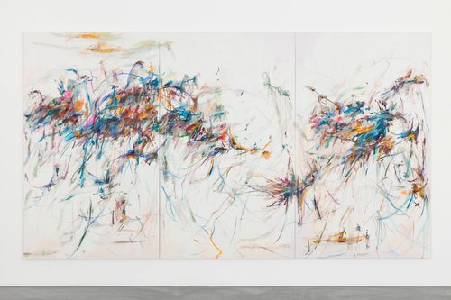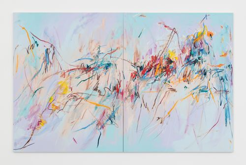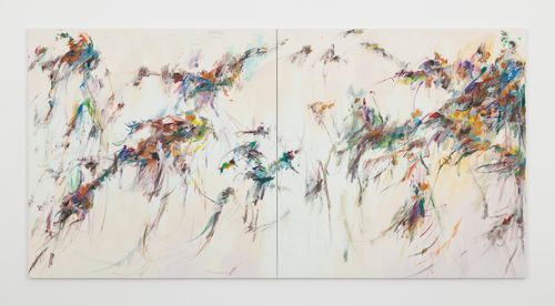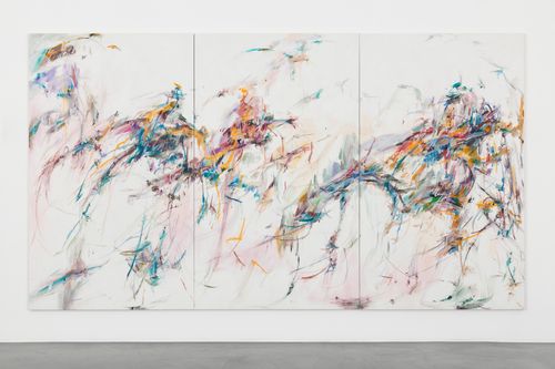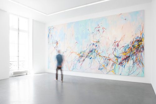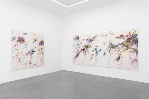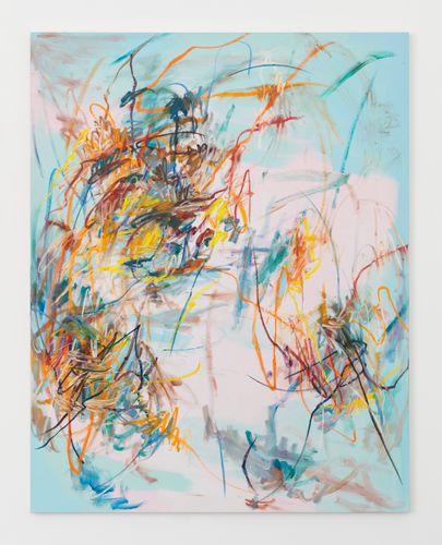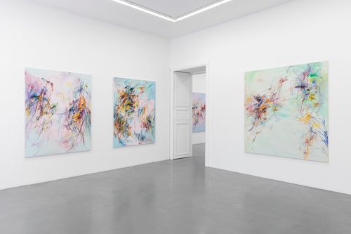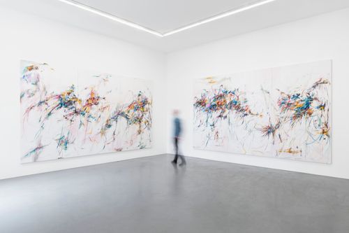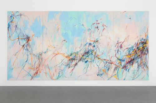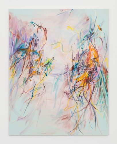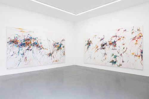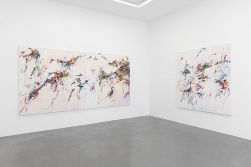 We are pleased to present Xiyao Wang’s first exhibition at the gallery. The young, Berlin-based Chinese artist creates large-scale, immersive paintings in which gestural lines evoke echoes of landscapes, bodies, movements, thoughts. The Crystalline Moon Palace, the title of her exhibition, borrowed from a series of paintings in the show, refers to an ancient Chinese myth around the moon goddess Chang’e.
