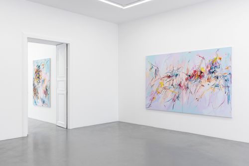 In the process, Xiyao Wang develops a kind of hybrid abstract painting that combines various influences and inspirations: Taoism and post-structuralism, ancient Chinese pictorial traditions, bodywork, dance, martial arts, and the canon of Western art history. In her work, mythologies and the lyrical, hermetic painting of Cy Twombly merge with global mass culture, electronic music, with the networked, media-influenced thinking of millennials and Gen Z. Xiyao’s paintings explore inner visions, bodily perceptions, sensations, feelings, interrogating her East-West biography. In doing so, they always reflect very precise formal aspects and certain currents in the history of painting.