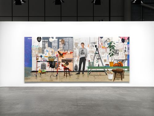 Conceptual artist #37 (he exclusively paints portraits of conceptual artists who have never existed) is the final painting from ‘The Conceptualists’, a major series of works by Hernan Bas featuring imagined protagonists engaged in obsessive pursuits that might be rationalized or even championed when framed as ‘conceptual art.’ The monumental triptych depicts an artist in his studio surrounded by paraphernalia referencing many of the creators and their peculiar practices explored throughout the series. Bas adds a further layer of humor in describing the figure in this work as an artist who ‘exclusively paints portraits of conceptual artists who have never existed.’ Set within Bas’s own studio, it brings the series to a close, acting as an index of sorts and revealing Bas’s own hand in devising his cast of artistic counterparts.