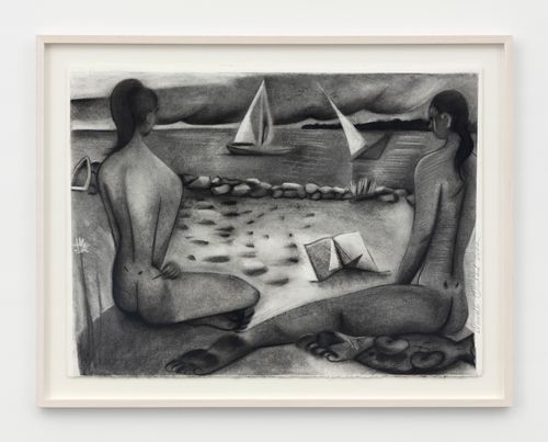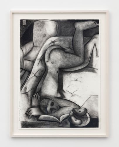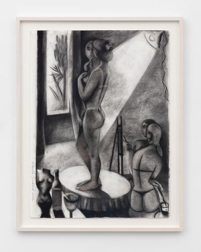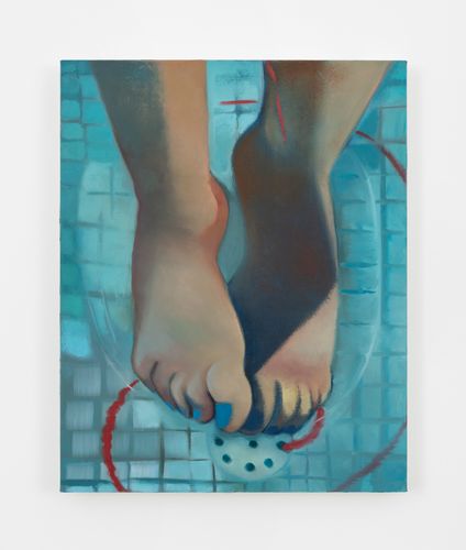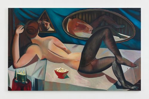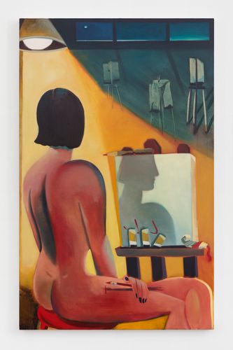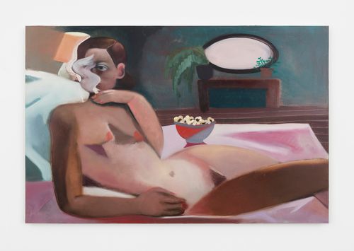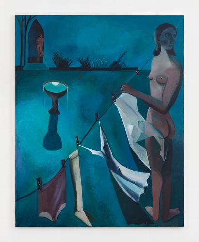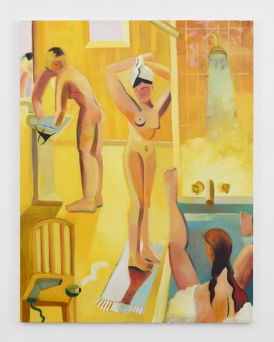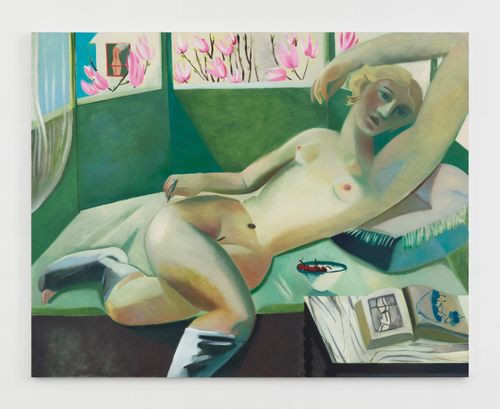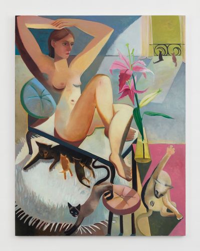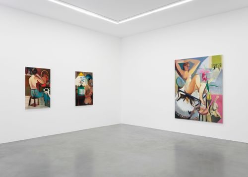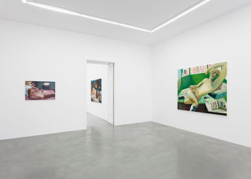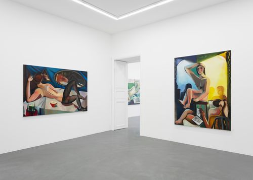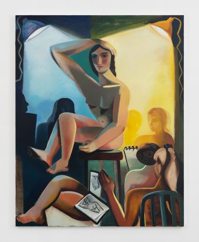 Danielle Orchard's oeuvre regularly summons the history of painting, from Cézanne to Picasso, from Bonnard to Matisse, whether through stylistic references to the multiple perspectives of analytical cubism, or through the recurrence of subjects. From an imaginary museum to a reclining odalisque that Orchard revisits with the gaze of a 21st-century artist – the paintings in the exhibition Page Turner echo, in a conscious and direct way, the master of young girls, the nude and suspended time. Omnipresent and displaced, timeless and abstract, Orchard's female figures appear nude in the familiarity of everyday scenes. The artist plays with movement and form, to twist reality and distort context, giving these daily activities an allegorical and sacred character.