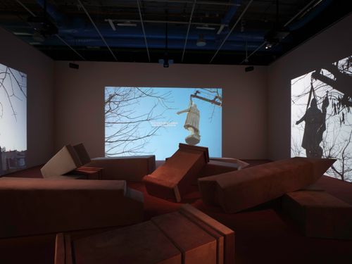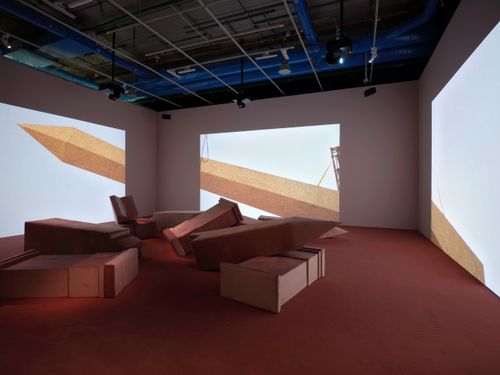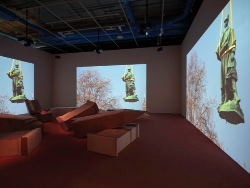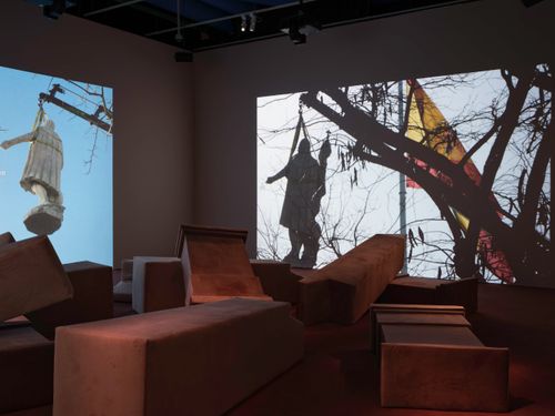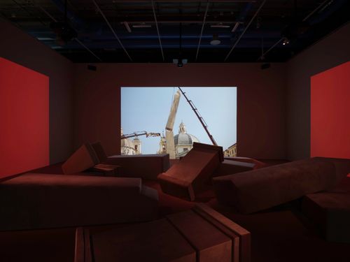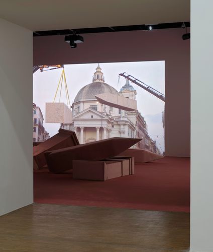 The artist presents Air de Jeux at the Centre Pompidou, as part of his nomination for Marcel Duchamp Prize. The installation gathers a film trilogy shot in Paris, Madrid and Roma and large pedestal-like volumes, obelisks and statues become cushions and furniture for sitting, lying, contemplating and conversing. Through a series of interventions in the public space, Iván Argote plays with the collective perception and tests the particular relationship we have with history and its artifacts.