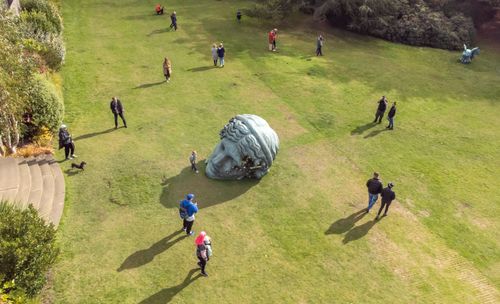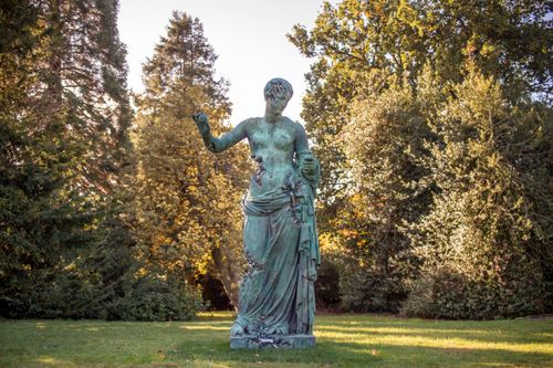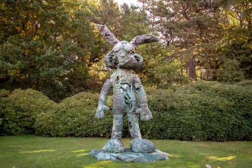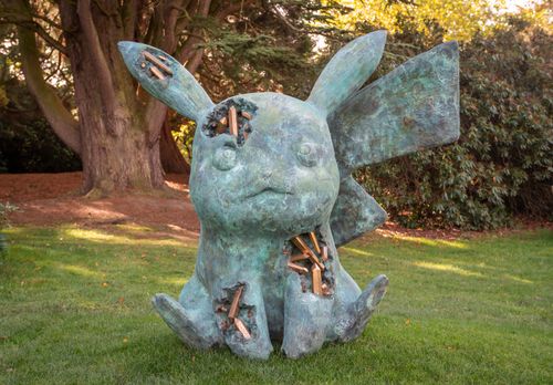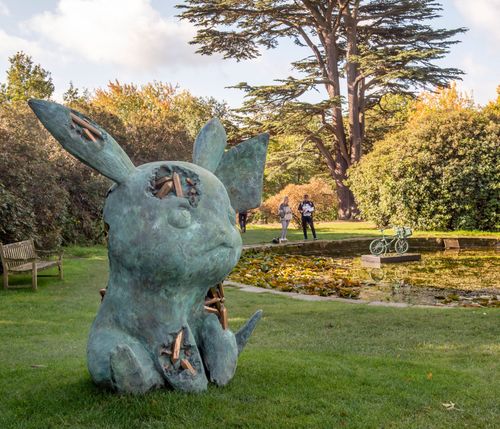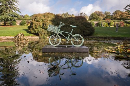 Six of Daniel Arsham’s bronze sculptures are shown outdoors in the 18th-century Formal Garden including Bronze Extraterrestrial Bicycle (2022), Bronze Eroded Bunny (Large) (2022), and the three-metre tall Bronze Eroded Venus of Arles (Large) (2022) – Arsham’s retelling of the ancient marble statue of Aphrodite from the 1st century BCE.